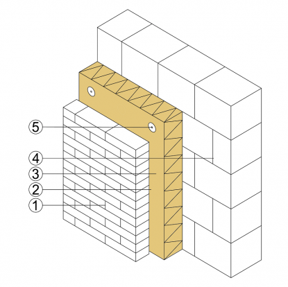 Izolacja ściany trójwarstwowej obejmuje ułożenie płyty izolacyjnej VestaEco WALL pomiędzy wewnętrzną warstwą nośną, a zewnętrzną warstwą osłonową z cegły, z pozostawieniem szczeliny wentylacyjnej. Otwarta dyfuzyjnie płyta izolacyjna ułatwia odprowadzenie wilgoci ze ściany murowanej. Mocowanie płyty do ściany murowanej przy pomocy kotew i talerzyków dociskowych.